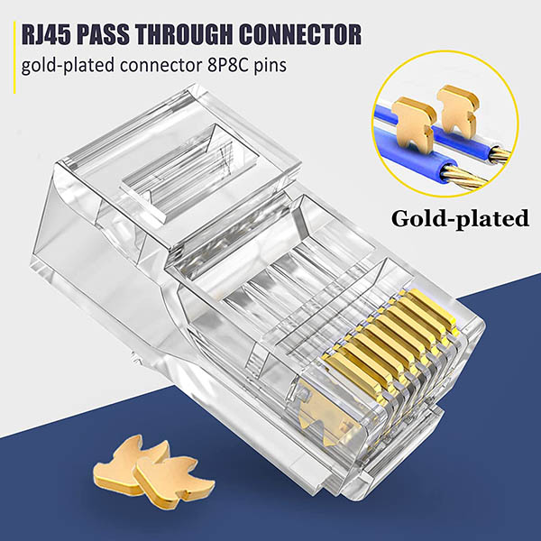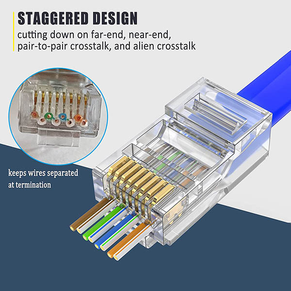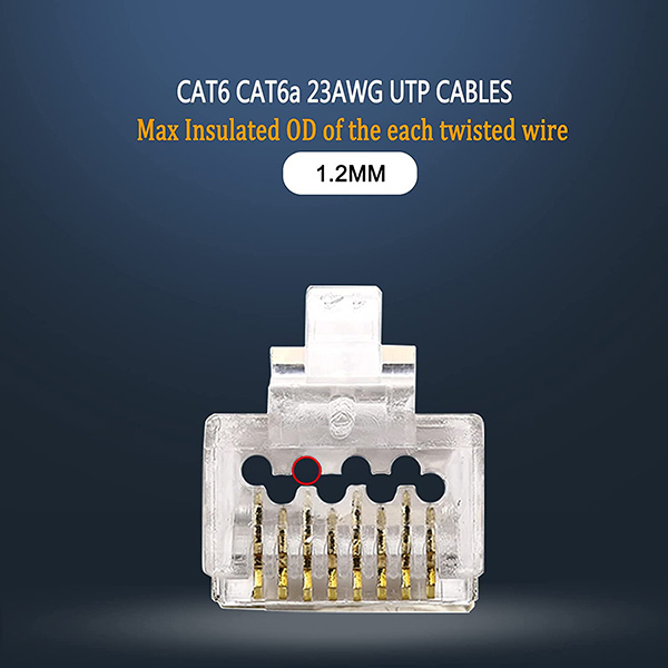 ►Category 6/6A Compatibility - RJ45 connector is for terminating cat6 cat6a unshielded UTP twisted pair network cable. Supports 23AWG solid and stranded cable; max insulated outside diameter of the wire: 1.20 mm. ►Less Pair-to-pair Crosstalk - 4-high, 4 low staggered design keeps wires separated at termination, which is cutting down on far-end, near-end, pair-to-pair crosstalk, and alien crosstalk for delivering efficient Category 6/6a signal integrity. ►Enhancing signal integrity and clarity by shortening the distance between wire twists and contacts. Gold plated metal connector pins work by piercing the cable jacket and making the contact attach to the copper wire closer for stable data transmission. ►Easily Identify Wiring Order - Pass through design simplifies terminations as the wires pass all the way through the RJ45 plug, allowing you to verify the wires are in the correct order before crimping with your rj45 crimp tool and minimize the bad terminations. ►50-pack of RJ45 Cat6 Cat6a connectors - Provide enough Ethernet connectors while home decoration wiring or add new network devices, allowing you to create your own Ethernet cables in custom length easier.